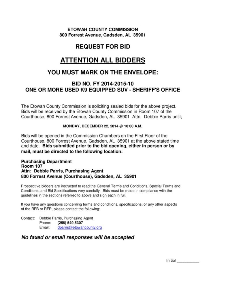 BID NO. FY 2014-2015-10 ONE OR MORE USED K9 EQUIPPED SUV – SHERIFF'S OFFICE AWARDED TO MISSOURI STATE HIGHWAY PATROL – 1/6/2015