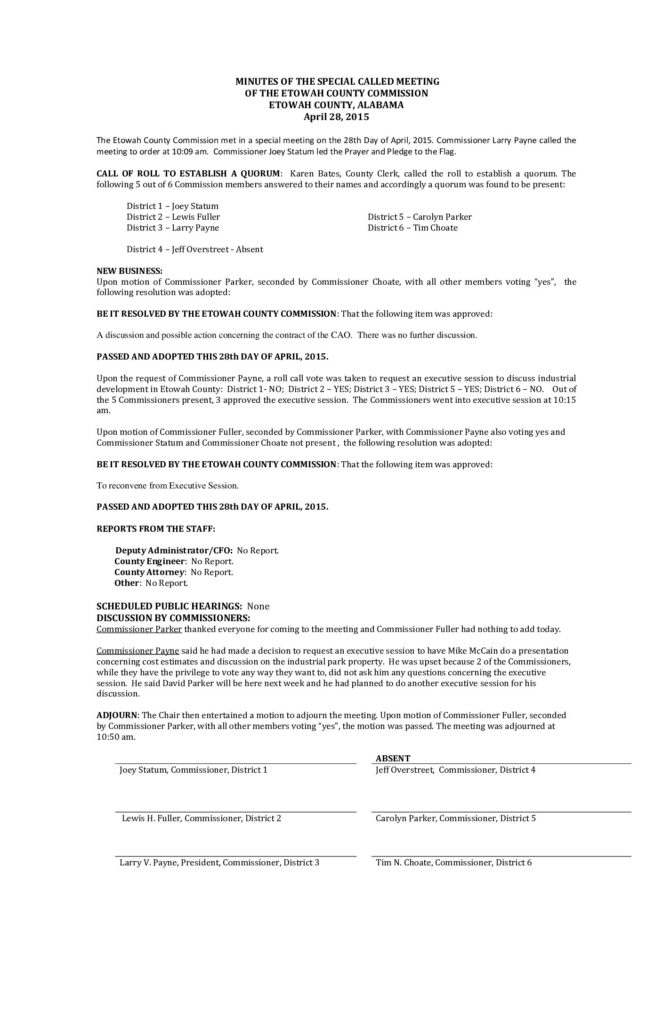 The April 7th and April 21st Minutes from the Etowah County Commission Meetings The Minutes from the Special Meeting on April 28, 2015.