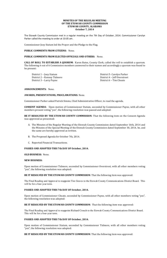 The minutes of the Etowah County Commission meeting on October 7, 2014.